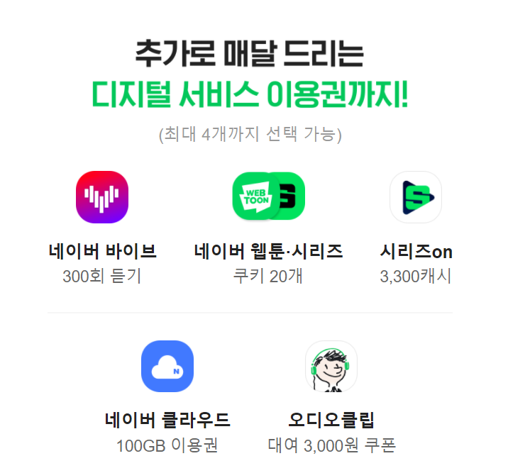 추가 선택 가능 서비스 : 네이버 바이브 300회 듣기, 티빙(TVING) 방송 무제한, 스포티비 나우(SPOTV NOW) 스포츠 무제한 (모든 VOD, TV채널), 네이버 웹툰/시리즈 쿠키 20개, 시리즈 on 3,300캐시, 네이버 클라우드 100기가(GB) 이용권, 오디오 클립 대여 3,000원 쿠폰 중 4가지 |