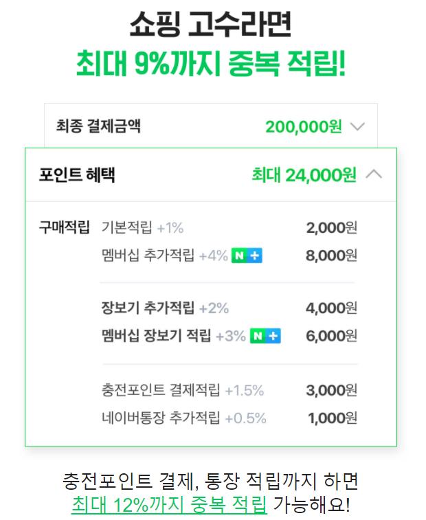 네이버 플러스 멤버십으로 다른 적립 이벤트와 함께한다면 최대 12%까지 중복 적립이 가능합니다.