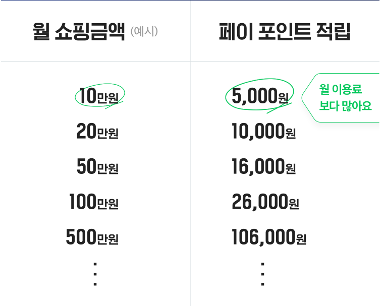 네이버플러스 멤버십을 가입, 네이버쇼핑으로 사용한 금액을 통해 받을수 있는 추가 적립 포인트는 다음과 같습니다. 아래 사진과 같이 월 10만원 이상 네이버 쇼핑을 통해 구매시 월 이용료 4,900원 보다 많은 포인트를 받을 수 있습니다. |