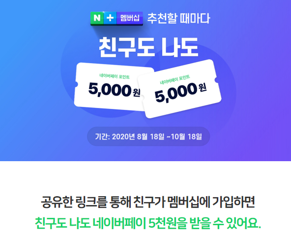 네이버페이 플러스 이벤트로, "공유한 링크를 통해 친구가 멤버십에 가입하면 친구도 나도 네이버페이 5천원을 받을 수 있어요." 친추 추천으로 무료 5천 포인트 받기 이벤트 내용은 아래 사진과 같습니다. 기존 8월 18일부터 10월 18까지 진행 예정인 이벤트 기간이, 최근 11월 18일까지 한달 연장됐습니다. |