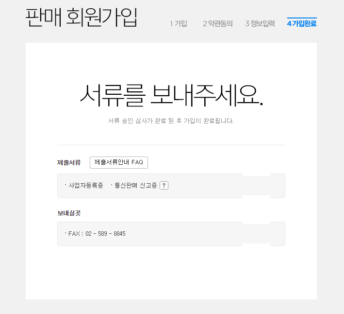 팩스로 사업자등록증 및 통신판매 신고증을 보내 사업자가 맞는지 서류 승인 심사 과정이 필요합니다.