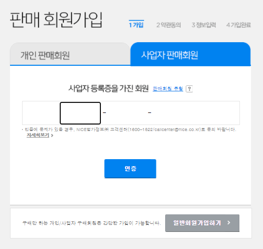 저는 사업자 판매회원으로 가입을 진행해봤는데요. 사업자의 경우 사업자등록번호를 입력시키면 됩니다.