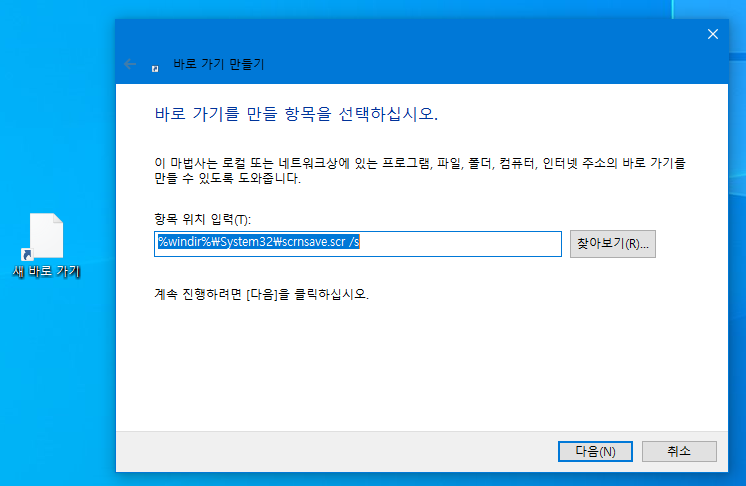 위와 같은 명령어를 바로가기 만들기 항목 위치입력 란에 입력, 다음 버튼을 클릭해주세요