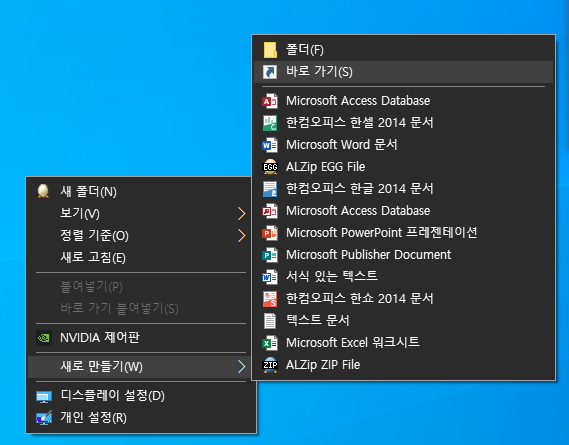 먼저 위의 사진과 같이, 바탕화면에서 우측 마우스 클릭 후 "새로만들기(W)" > "바로가기" 클릭