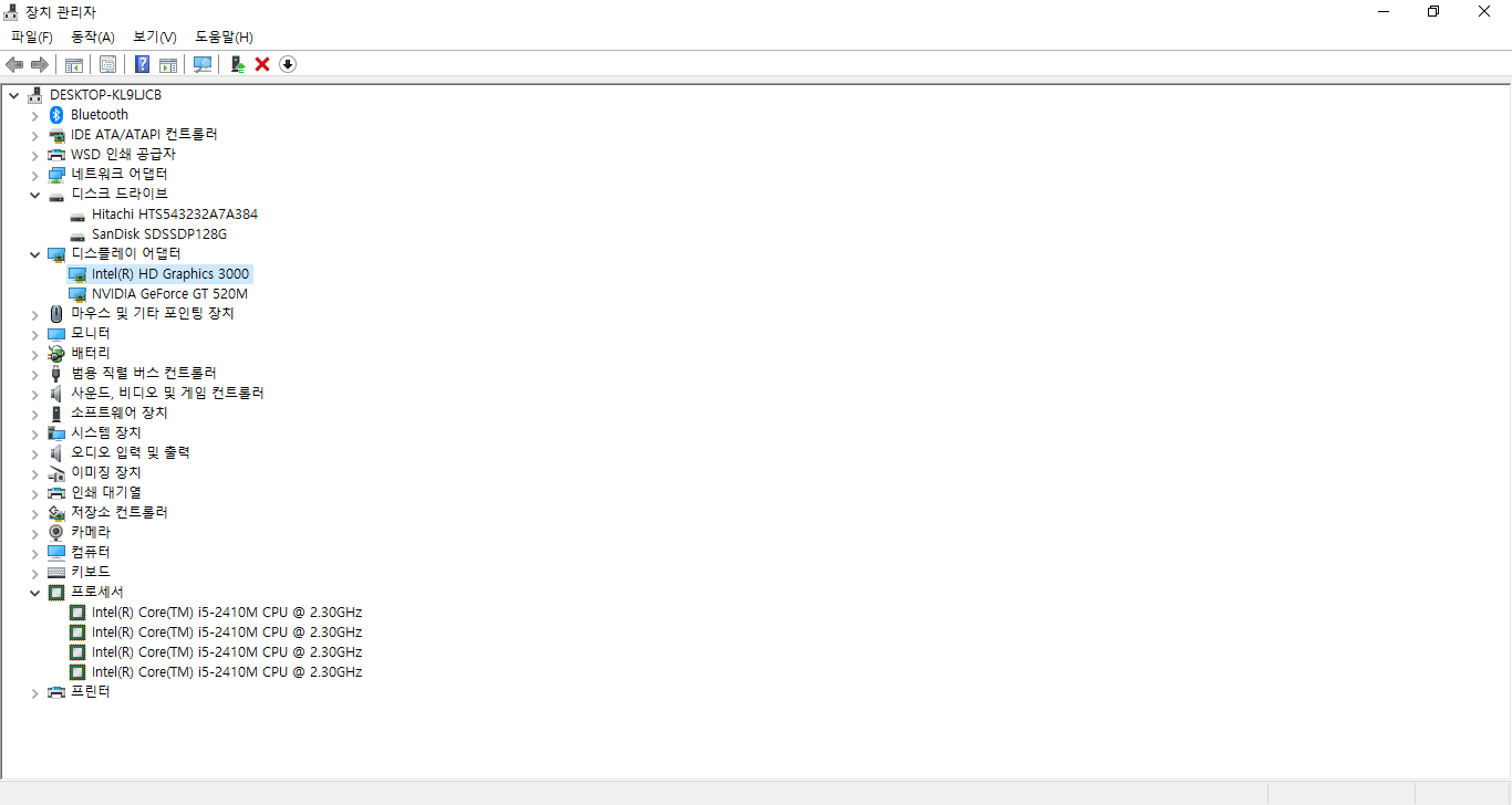 - 스펙 CPU : Intel i5-2410M CPU 2.30GHz (2세대 샌디브릿지) 그래픽카드(VGA) : NVIDIA GeForce GT 520M (외장) + 내장 그래픽 (Intel HD Graphics 3000) 저장장치 : 샌디스크 SSD 128기가 + ODD 대신 멀티부스트로 (HDD 320GB) 램(RAM) : 6기가(6GB) - 4GB에 2GB 추가한걸로 기억합니다.