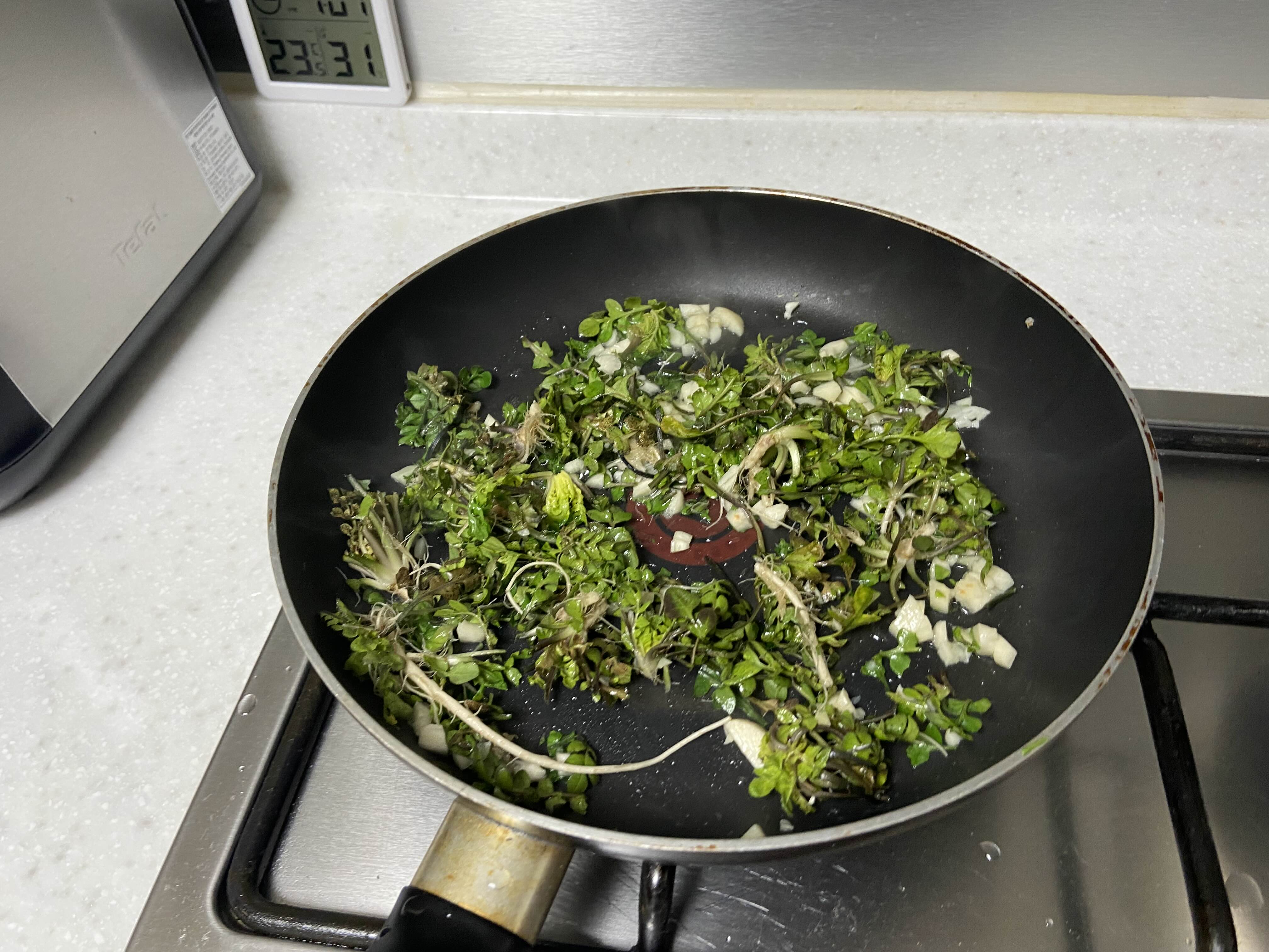 냉이 한움큼 (1인분) 마늘 4-5개 (옵션) 파스타 면 (1인분) 간장 (1스푼 or 1스푼 반) 설탕 (1스푼 or 1스푼 반) 냉이를 볶을 기름 (참기름, 해바라기유 등) |