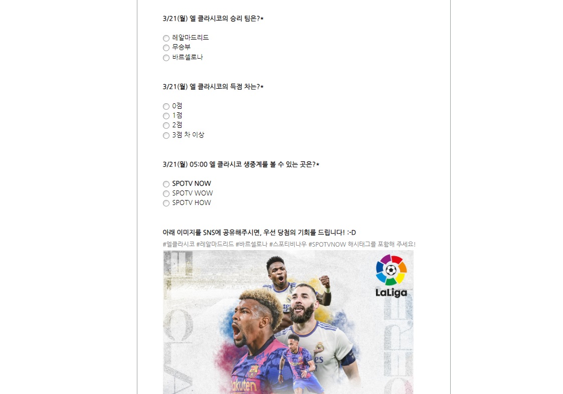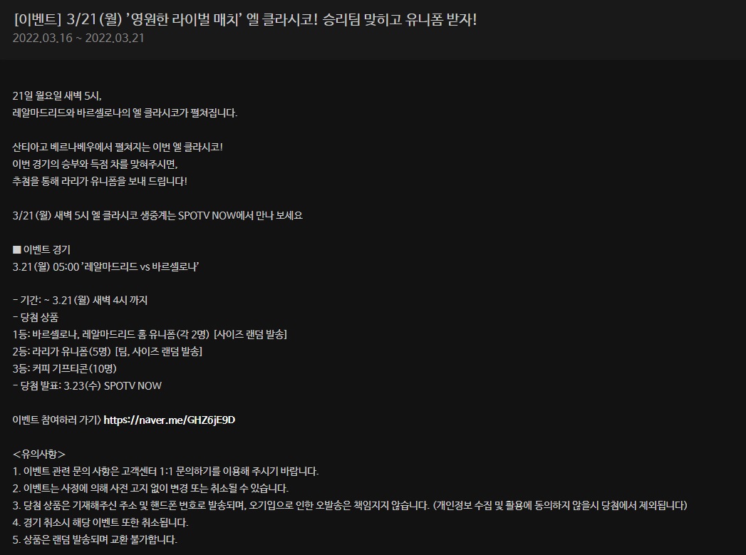 상품으로 레알마드리드, 바르셀로나, 라리가 유니폼 및 커피 기프티콘을 준다는데요.
