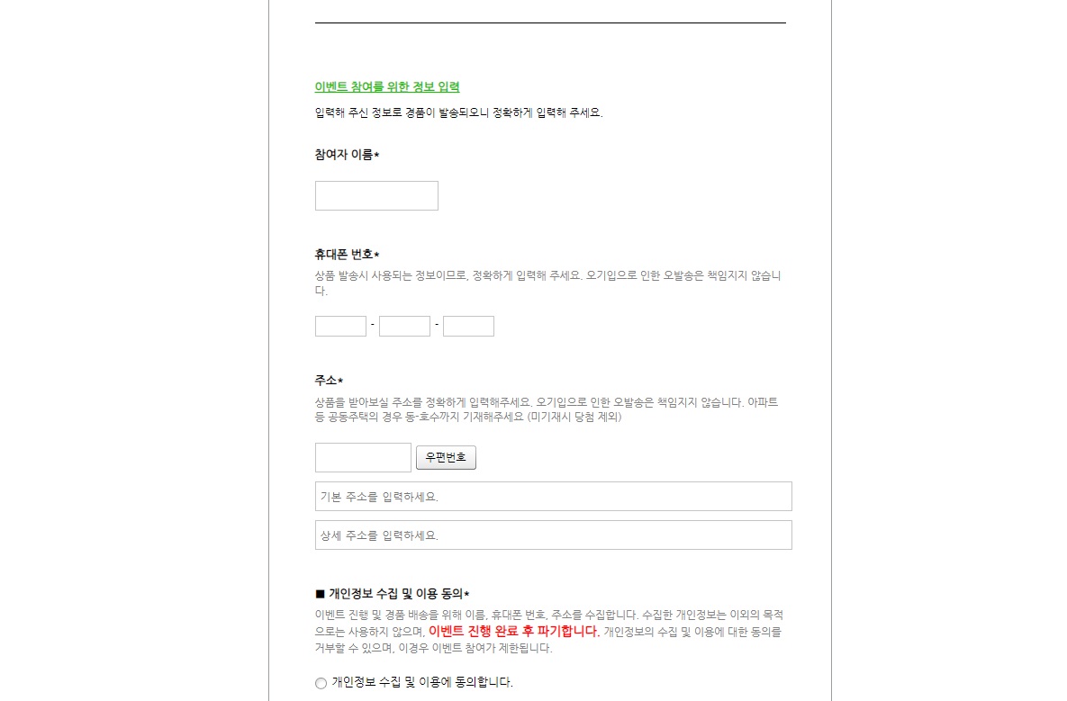 3. 당첨 상품은 기재해주신 주소 및 핸드폰 번호로 발송되며, 오기입으로 인한 오발송은 책임지지 않습니다. (개인정보 수집 및 활용에 동의하지 않을시 당첨에서 제외됩니다)
